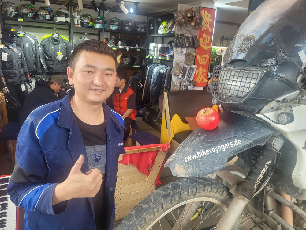 Am nächsten Tag rücken wir mit einer riesigen Kiste Bier als Dankeschön an. Wieder gibt es Tee, wir dürfen unsere Motorräder waschen. Und schließlich kleben die Jungs von Bapmed je einen großen Plastikapfel auf die drei Motorräder. In China steht der Apfel für Friede, Freundschaft, Harmonie.
