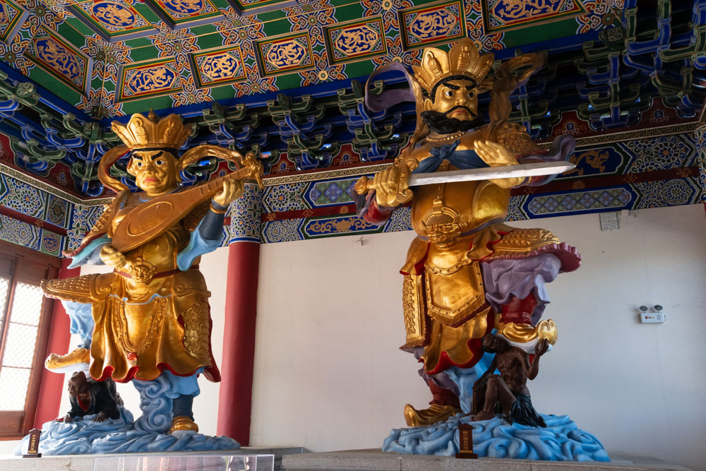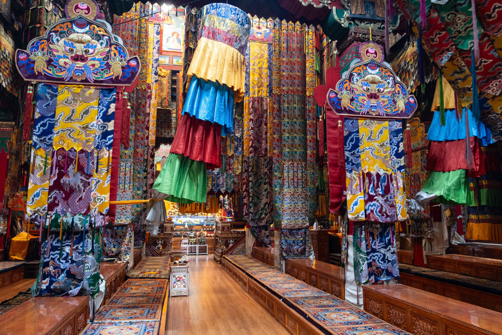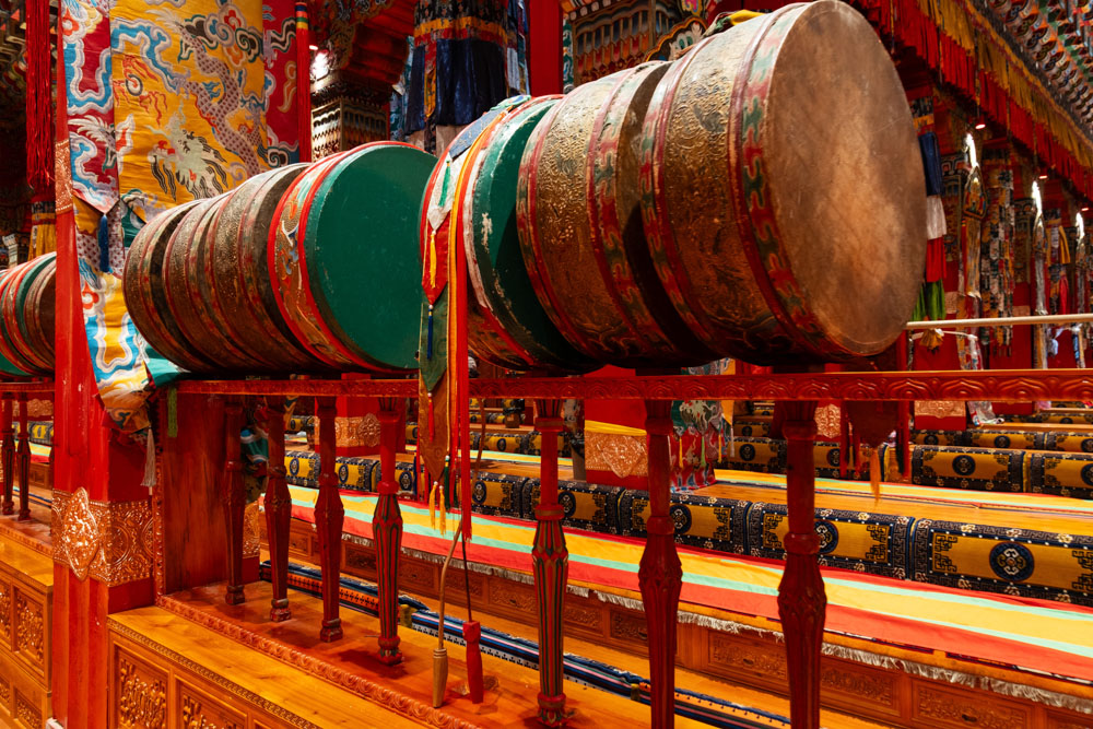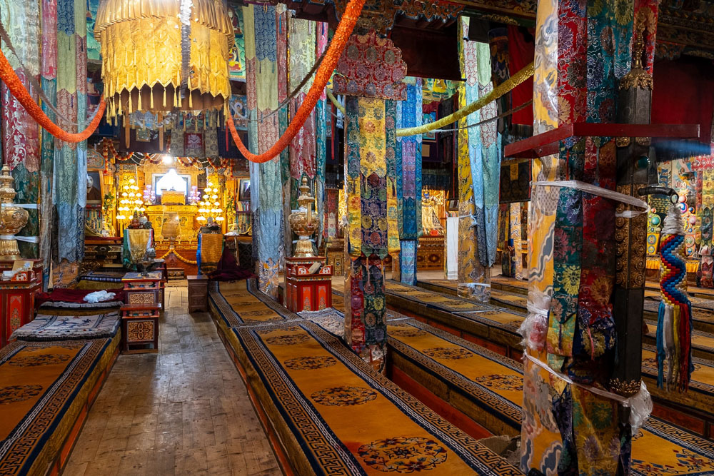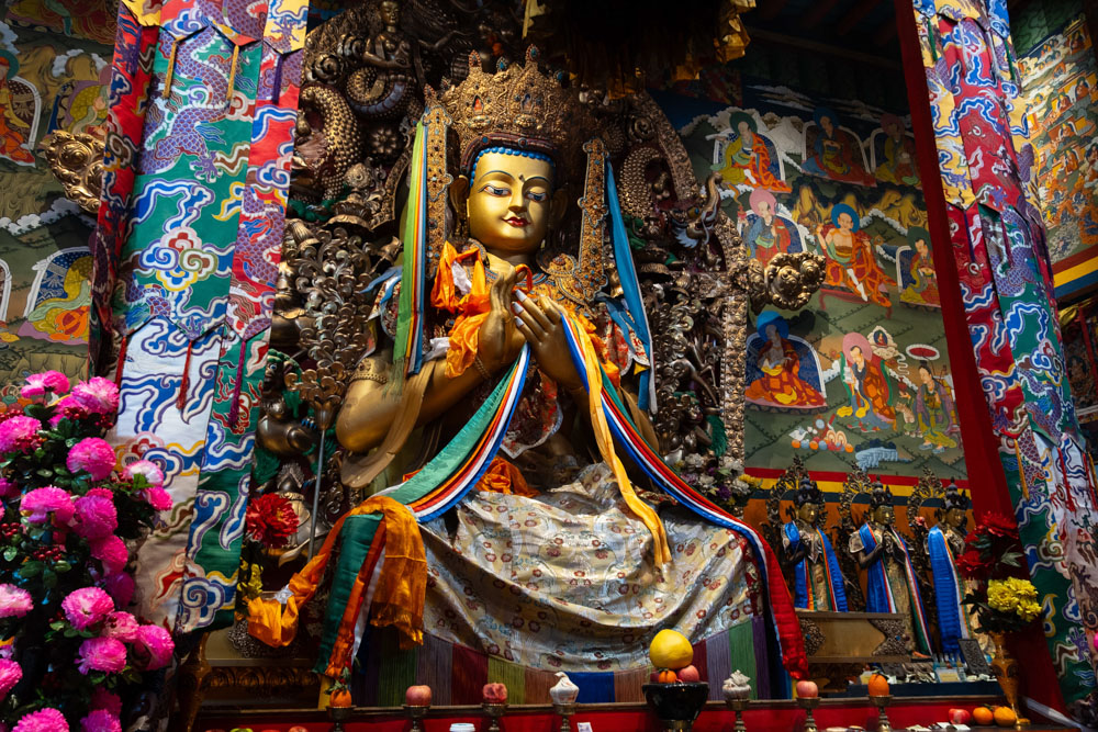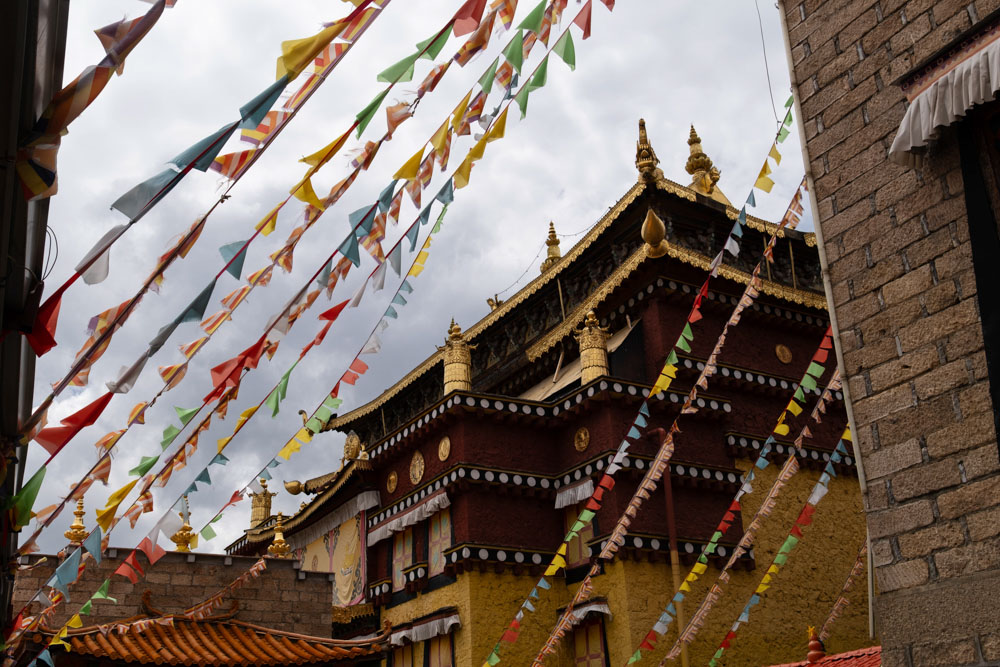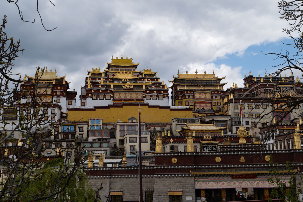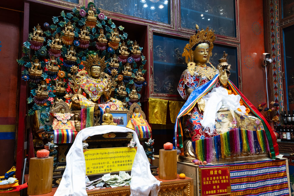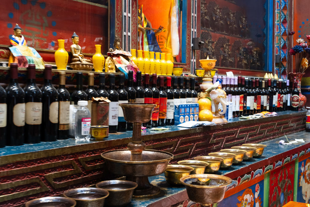 Wir sind neugierig geworden auf den tibetischen Buddhismus und genießen die Zeit ohne Guides und Reisegruppe. So besuchen wir anderntags das riesige Kloster Ganden Songtsenling, das 1679 vom fünften Dalai Lama gegründet wurde und eine Schule der Gelug-Strömung des tibetischen Buddhismus beherbergt. Eine Vielzahl von Tempeln mit großen Gebetshallen und imposanten Buddha-Statuen zieht uns in ihren Bann. Die meisten davon sind mit reichlich Gaben von den Gläubigen umgeben, meist Essen und Getränke. Ein Buddha ist umringt von Dutzenden von Weinflaschen. Siddharta geht es offenbar recht gut…