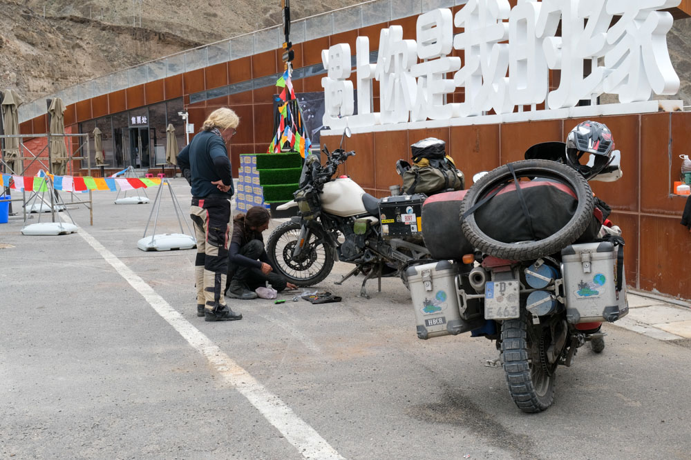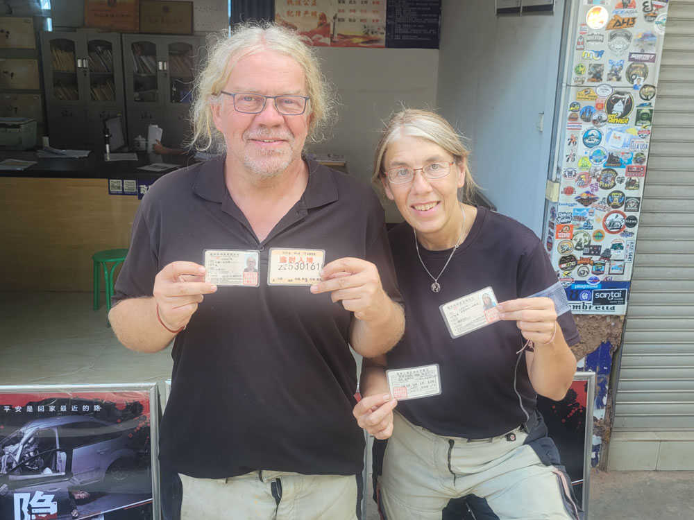 An der Grenze treffen wir auch den Agenten Edward – Chinesen tendieren dazu, sich westliche Namen zu geben – und die als Guide angestellte Alex. Sie organisieren mit den vorbereiteten Dokumenten den Grenzübertritt. An der chinesischen Grenze lassen wir die Gesichtserkennung und alle anderen Malaissen über uns ergehen. Ein Vorgeschmack auf einen totalitären Überwachungsstaat. Die Grenzen sind in halbwegs erträglicher Zeit absolviert, doch die Ausstellung unserer ebenfalls vorbestellten SIM-Karten zieht sich über Stunden hin. 20 Kilometer weiter bekommen wir auf einem Amt unsere chinesischen Führerscheine und unsere neuen Kennzeichen – beides im Scheckkartenformat – ausgestellt. Und beides hat eher symbolischen als praktischen Wert.