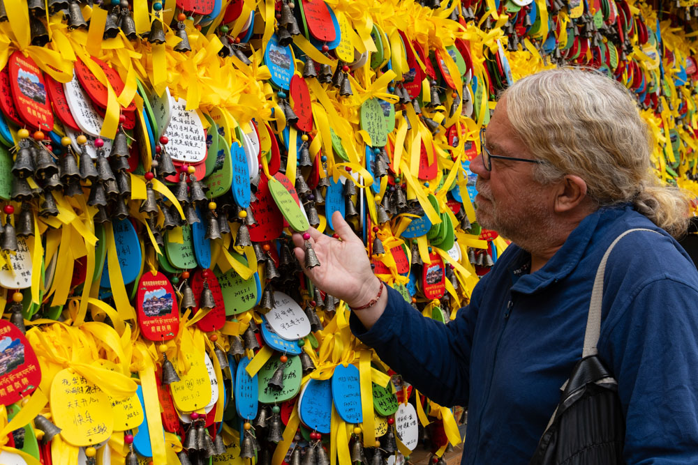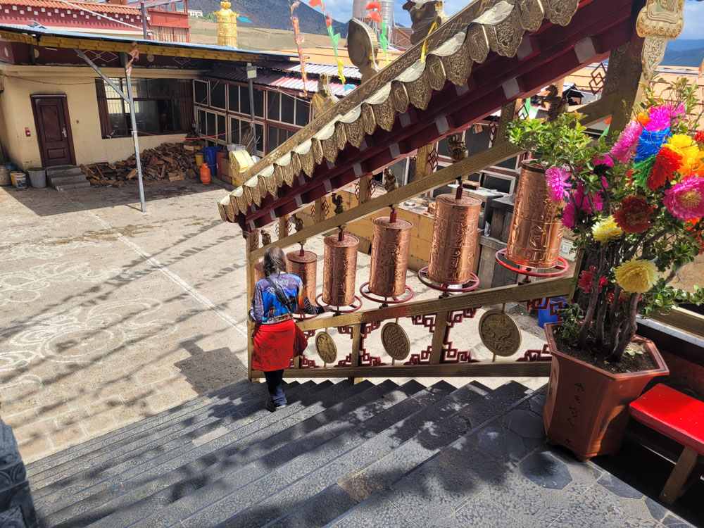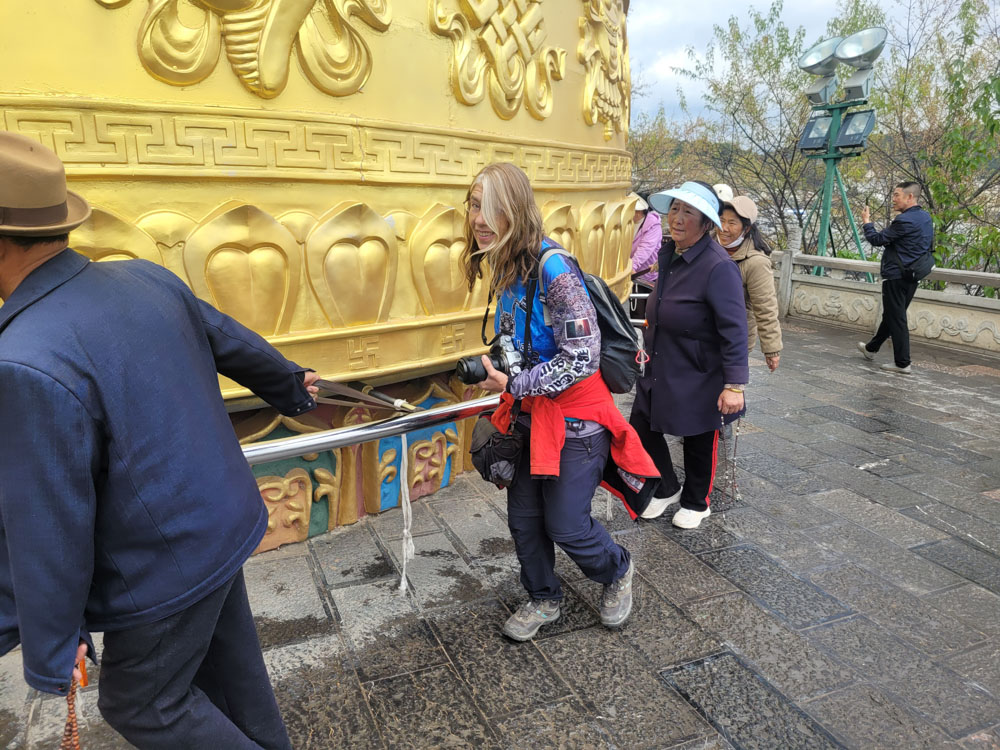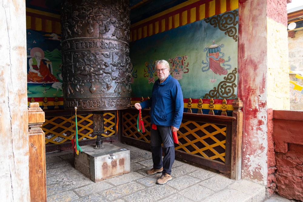Wir natürlich mittendrin. Gebetsmühlen sind meist hölzerne oder blecherne Walzen mit Gebeten und Mantras, die von Mönchen oder Passanten gedreht werden und sollen an das Antreiben des Rads der Lehre durch Buddha persönlich erinnern.