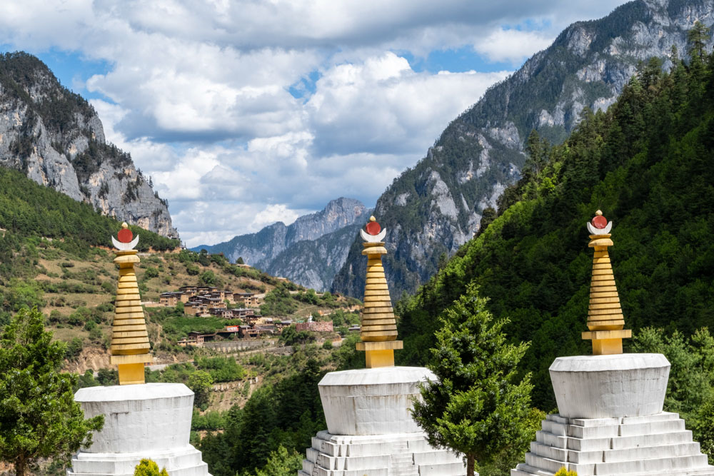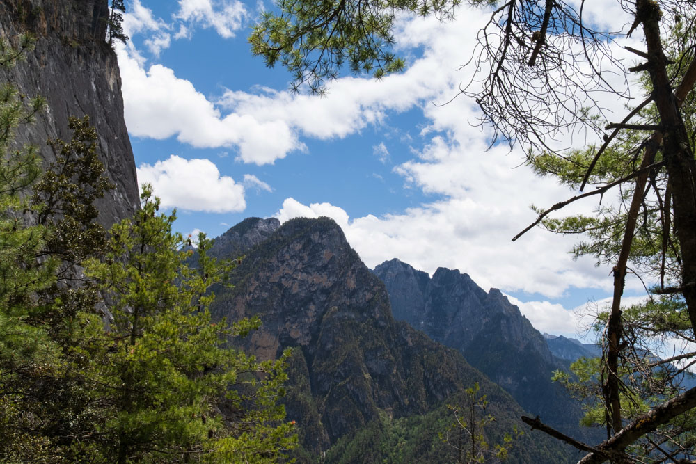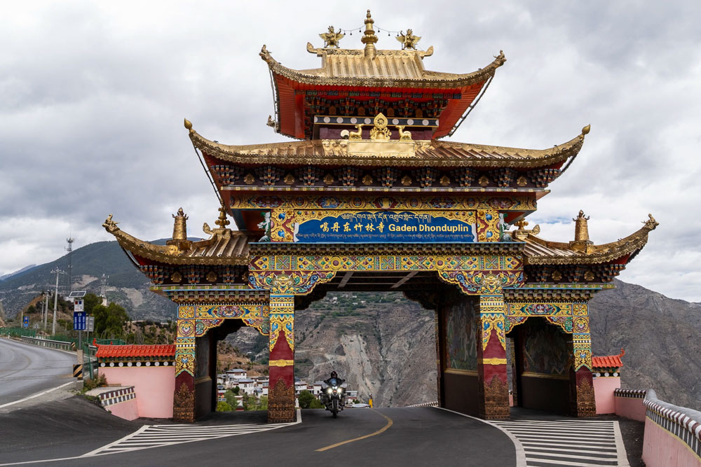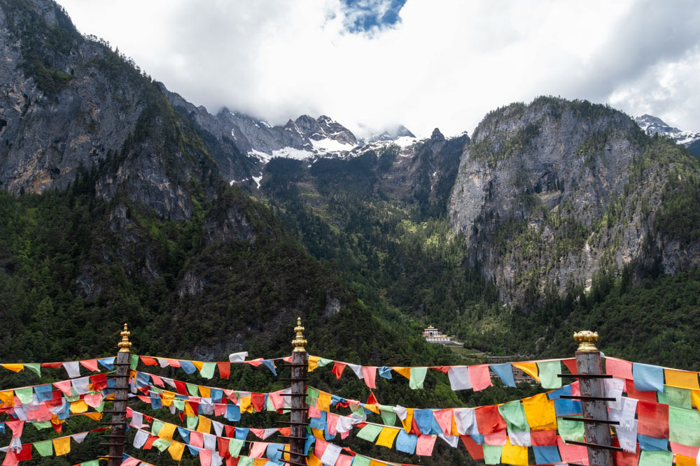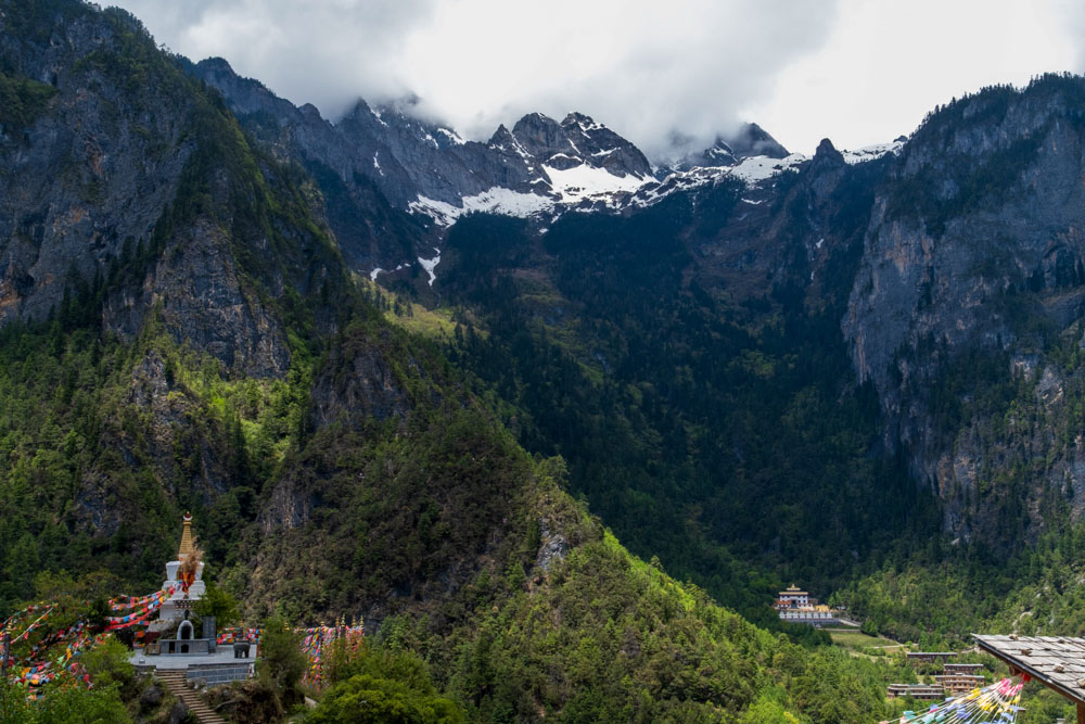 Nach zwei Nächten fällt uns die Wolkendecke auf den Kopf, und wir holen uns von Alex die Erlaubnis ein, schon einen Tag früher zu unserer nächsten Station vorzufahren. In einer Regenpause machen wir uns auf den Weg nach Shangri La. Die Route besteht zwar in der Hauptsache aus Autobahn und gefühlt zu 90 Prozent aus gut ausgebauten und vor allem beleuchteten Tunneln. Doch erhaschen wir immer wieder Ausblicke auf die umliegende Bergwelt mit tiefen Schluchten.
