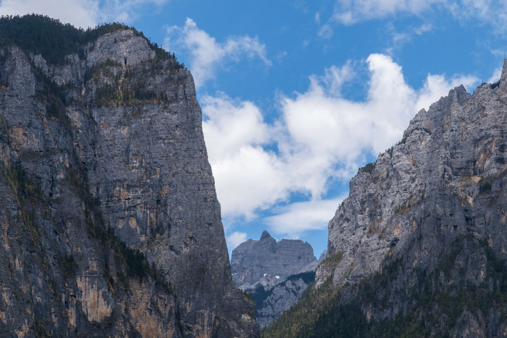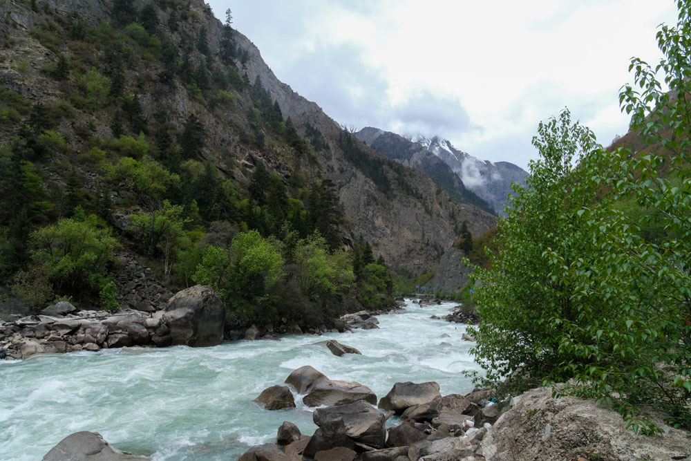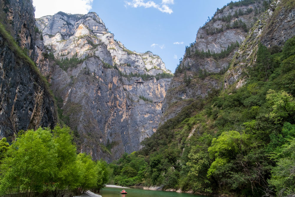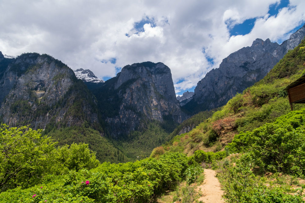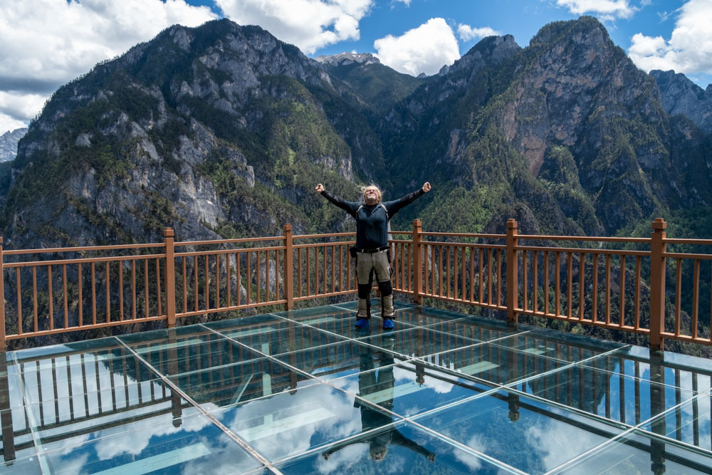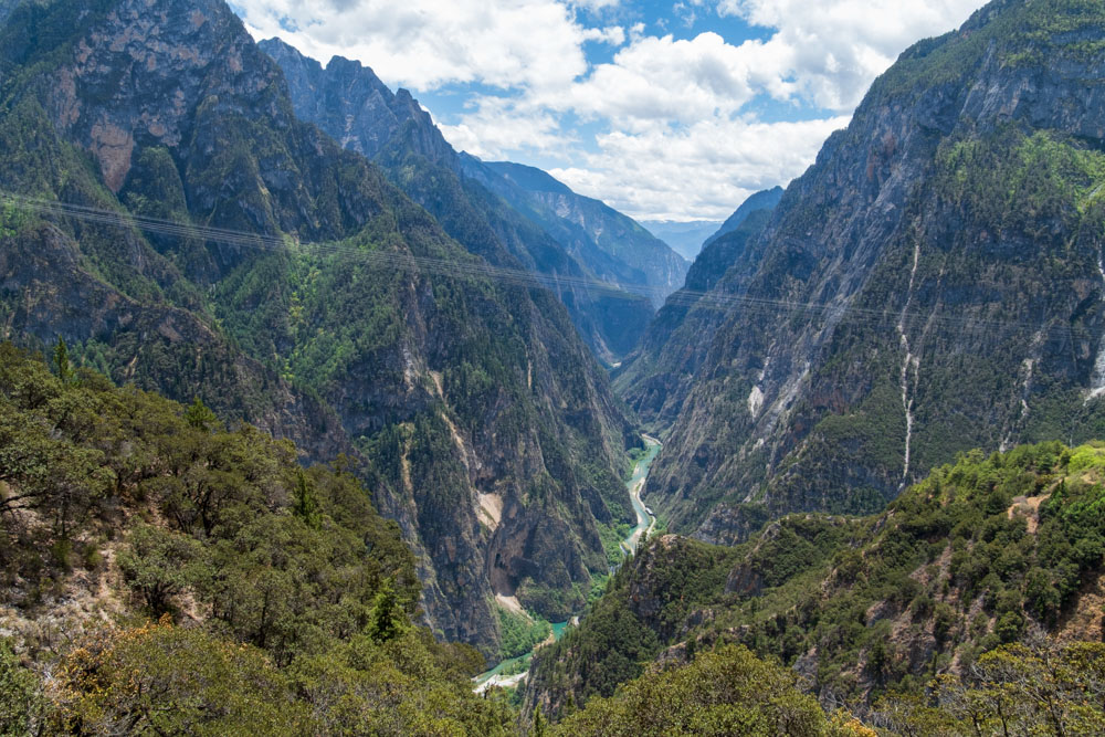 Nach zwei Nächten fällt uns die Wolkendecke auf den Kopf, und wir holen uns von Alex die Erlaubnis ein, schon einen Tag früher zu unserer nächsten Station vorzufahren. In einer Regenpause machen wir uns auf den Weg nach Shangri La. Die Route besteht zwar in der Hauptsache aus Autobahn und gefühlt zu 90 Prozent aus gut ausgebauten und vor allem beleuchteten Tunneln. Doch erhaschen wir immer wieder Ausblicke auf die umliegende Bergwelt mit tiefen Schluchten.