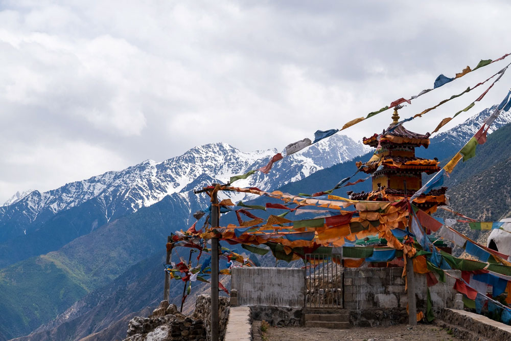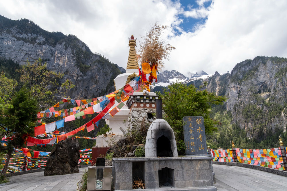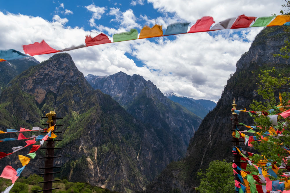 Wir wollen die spektakuläre Berglandschaft rund um Shangri La erkunden und stoßen auf einen Ort namens „Grand Canyon“. In den USA konnten wir seinen großen Namensvetter nicht besuchen, also statten wir seinen kleinen Bruder in China eine Visite ab. Flugs fahren wir die 30 Kilometer bis zu dem Naturwunder. Am Eingang müssen wir in einen Bus wechseln, der uns tief hinein zu verschiedenen Stationen entlang des vom Fluss Gangqu durchflossenen Canyon fährt. Schroff ragen die Berge auf, tief hat sich der Fluss hinein geschnitten. Allenthalben gespickt mit kleinen Pagoden und Gebetsfahnen. Die Ausblicke, die wir erhaschen, sind schlicht spektakulär. Und die buddhistischen Stätten verleihen dem Ensemble eine gewisse Mystik.