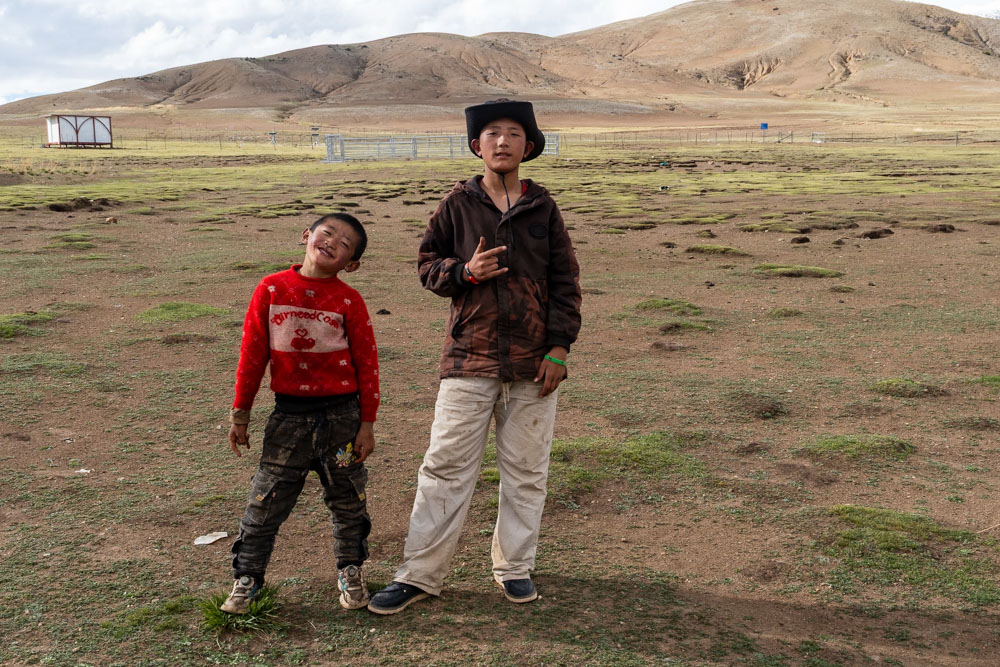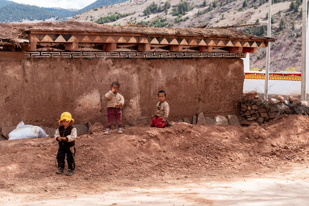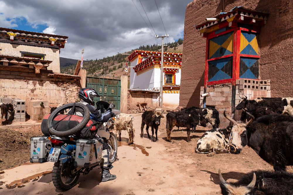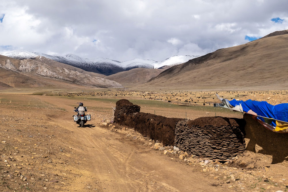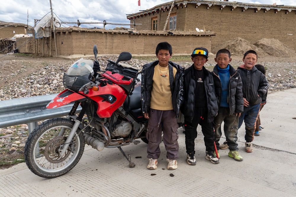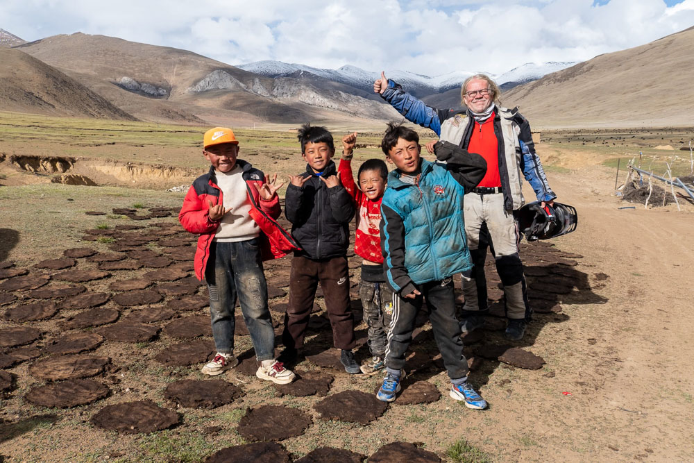 Yak-Fladen liegen in der Sonne zum Trocknen. Es ist der einzige Brennstoff hier oben, jenseits der Baumgrenze. Eine Horde Kinder ist auf uns aufmerksam geworden. Unsere Erscheinung scheint sie zunächst ein wenig zu verschüchtern. Merkwürdig aussehende Menschen auf Motorrädern, in Klamotten, die sie noch nie gesehen haben. Doch als Andrea eine Tüte Bonbons aus dem Koffer kramt, gibt es kein Halten mehr. Die Kleinen stürmen auf sie ein, alles hüllt sich in eine Staubwolke und nur Sekunden später ist der Inhalt der Tüte Geschichte.