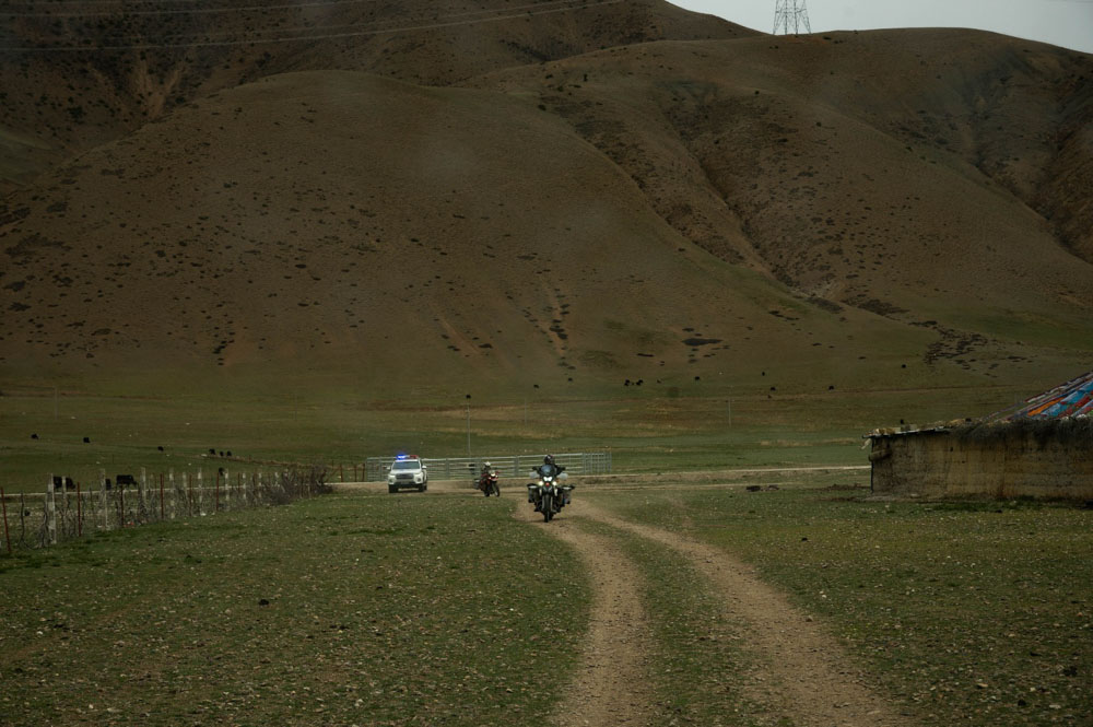 Wir fotografieren die herrliche Natur und genießen den Sonnenschein, als Jamba anruft und uns zurück zitiert. Wir lassen uns Zeit, schießen Fotos vom echten Tibet, dass wir hier zum ersten Mal sehen. Als wir zurückkehren, kommt uns die Polizei mit Blaulicht entgegen. Auf der Rückbank unser Guide, der offenbar die Polizei informiert hat, dass wir von der Route abgewichen sind.